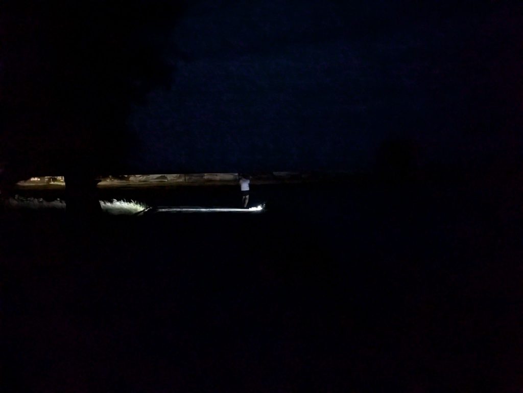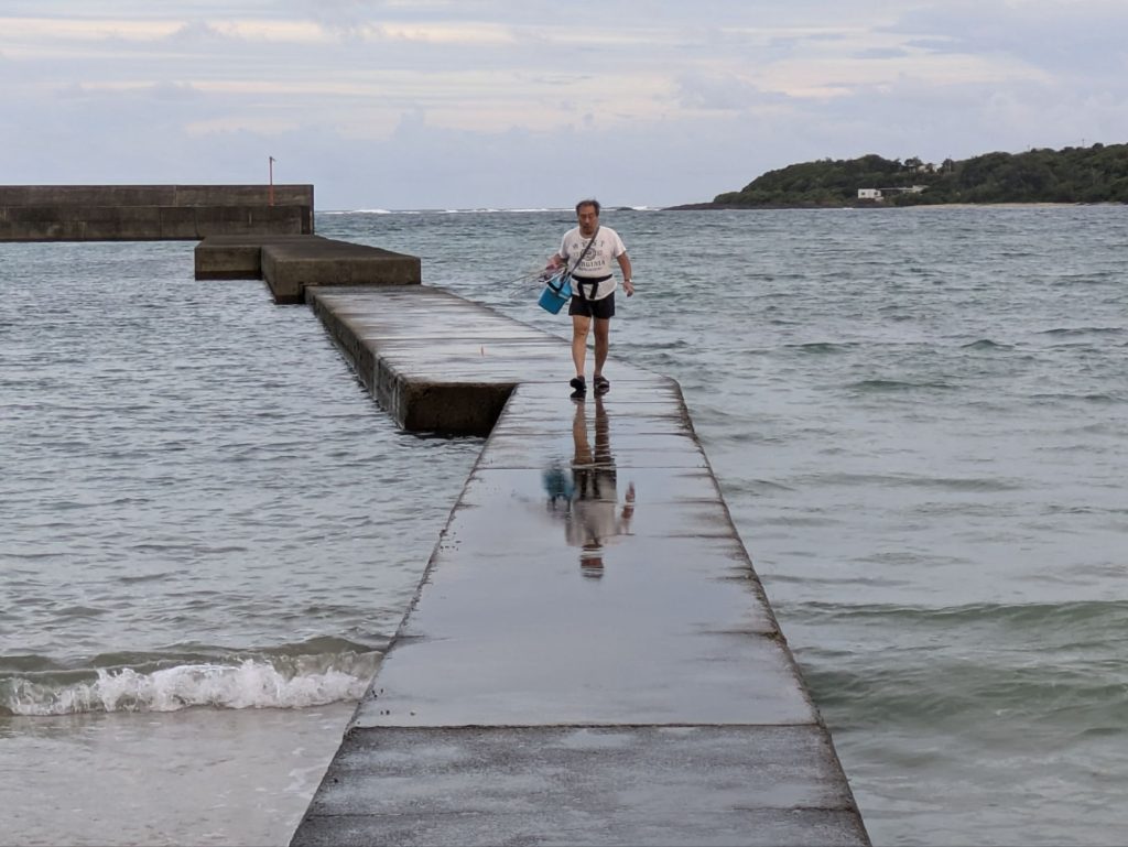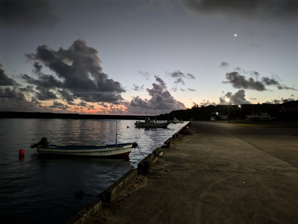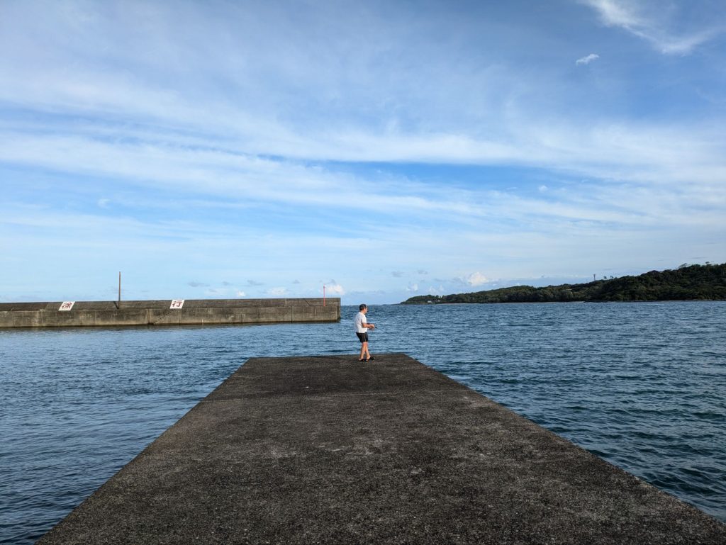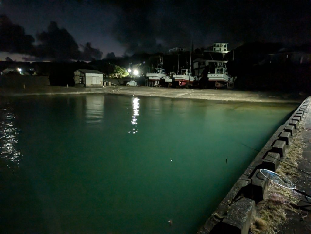 真っ暗な5時の満潮から6時半の日の出まで、大型ヒラアジの群れを目撃した南川漁港のスロープで粘る。