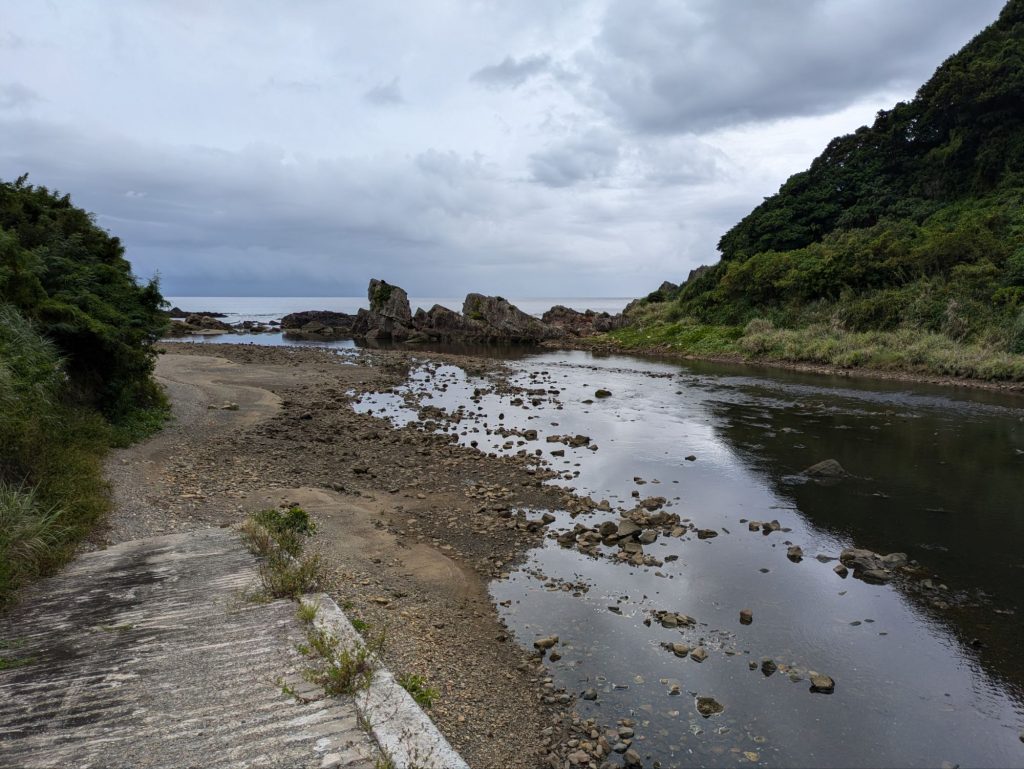 なんか漁港内のヒラアジには期待できそうもないんで、昼過ぎ一気に島の反対側、東シナ海に流れ込む秋利神川に行ってみることにした。