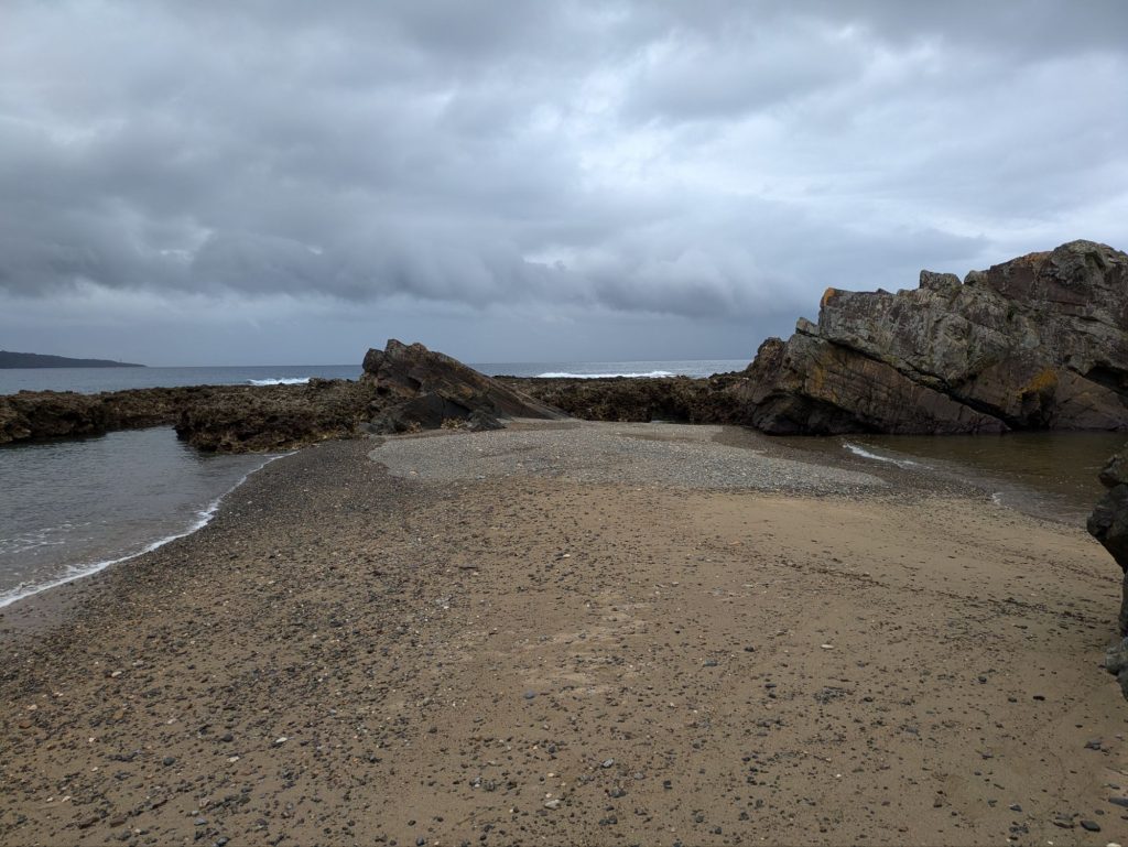 河口の岩場が地続きになっている。チャンス!… だが、空模様が怪しい… 。