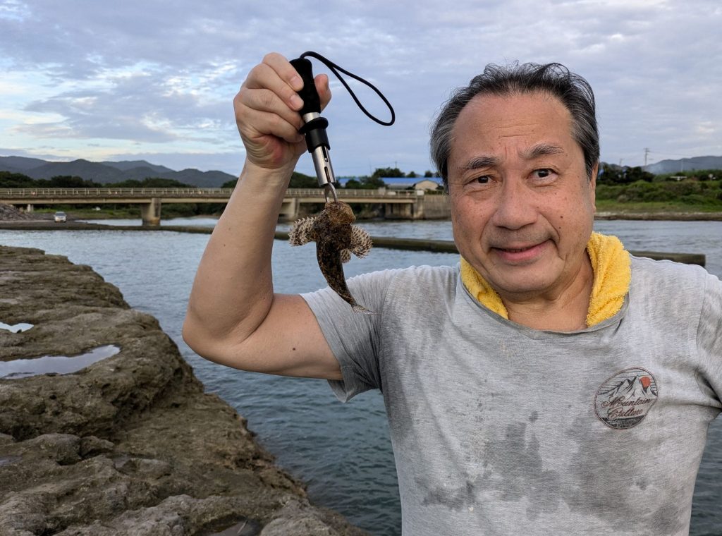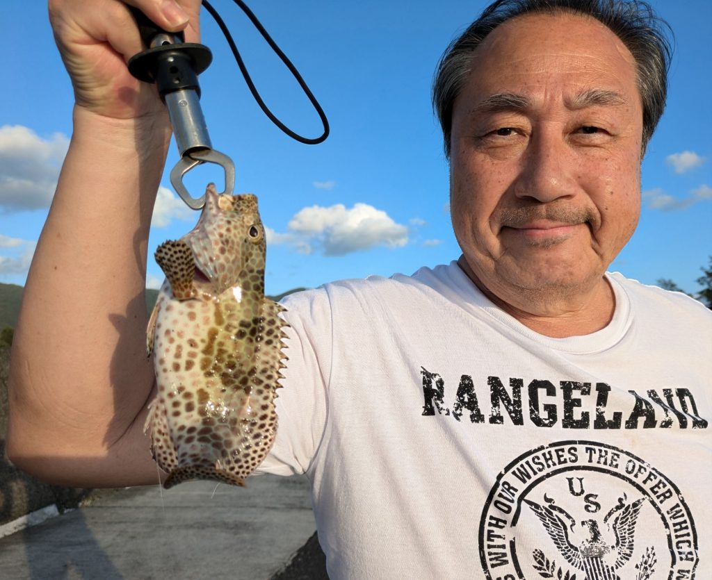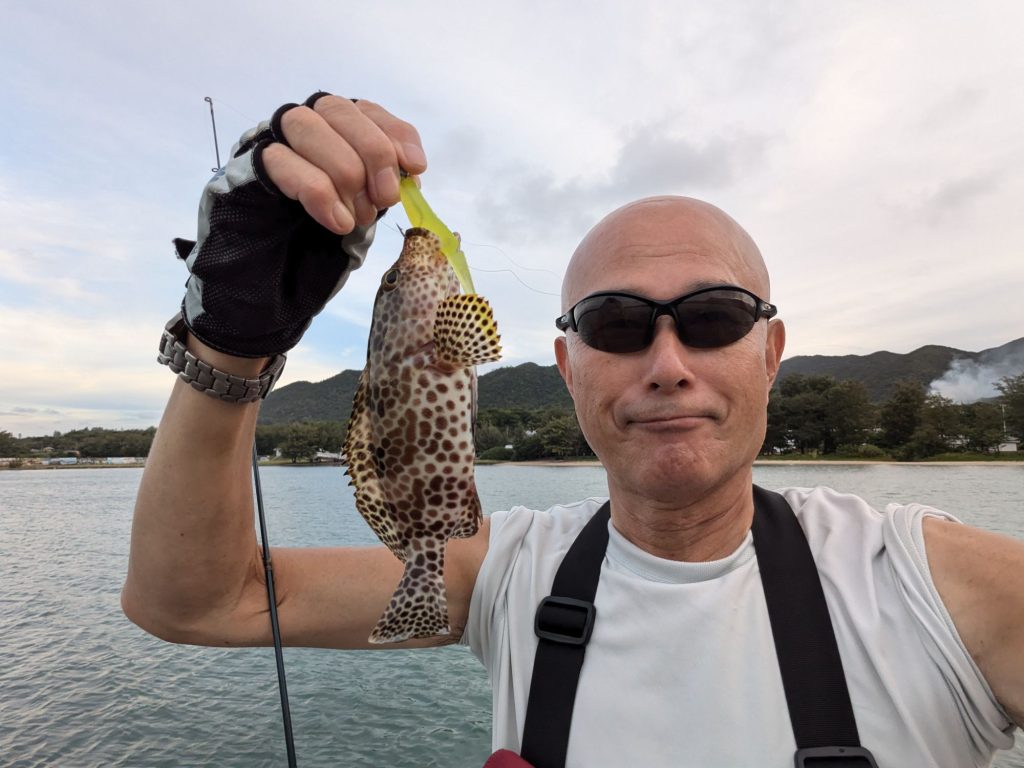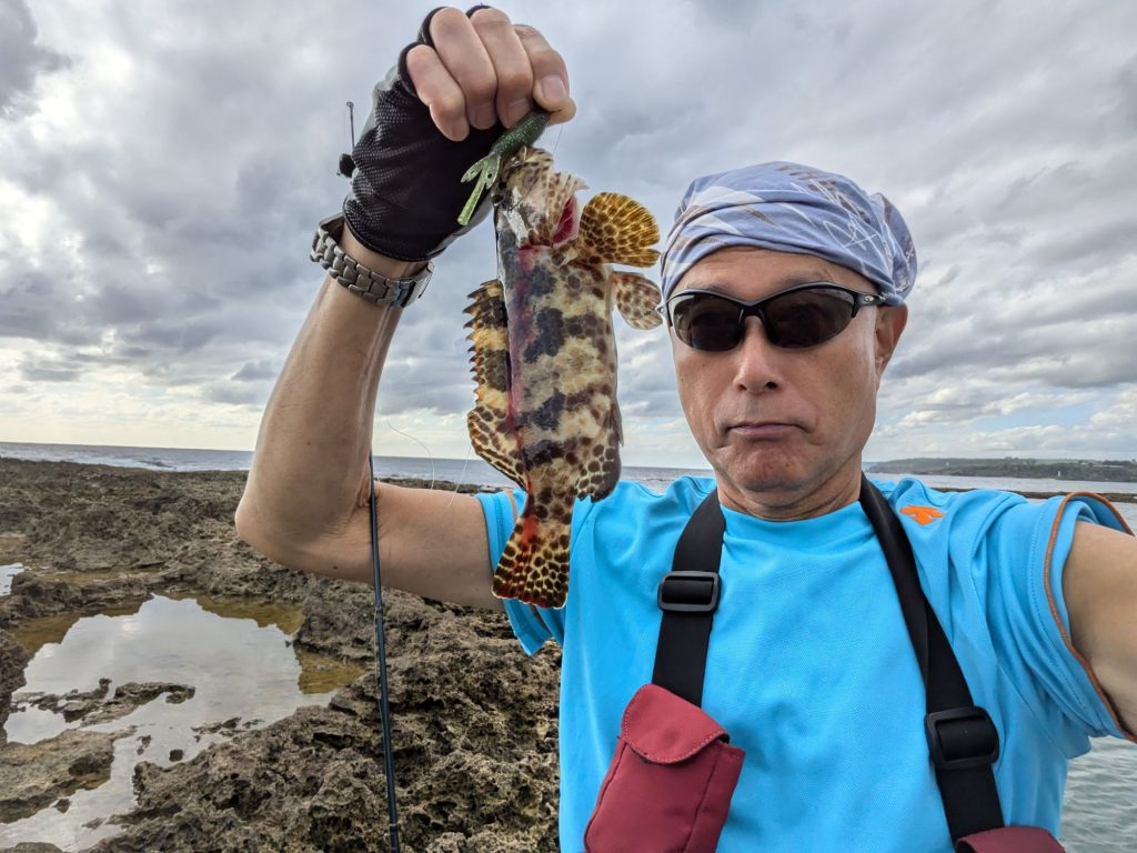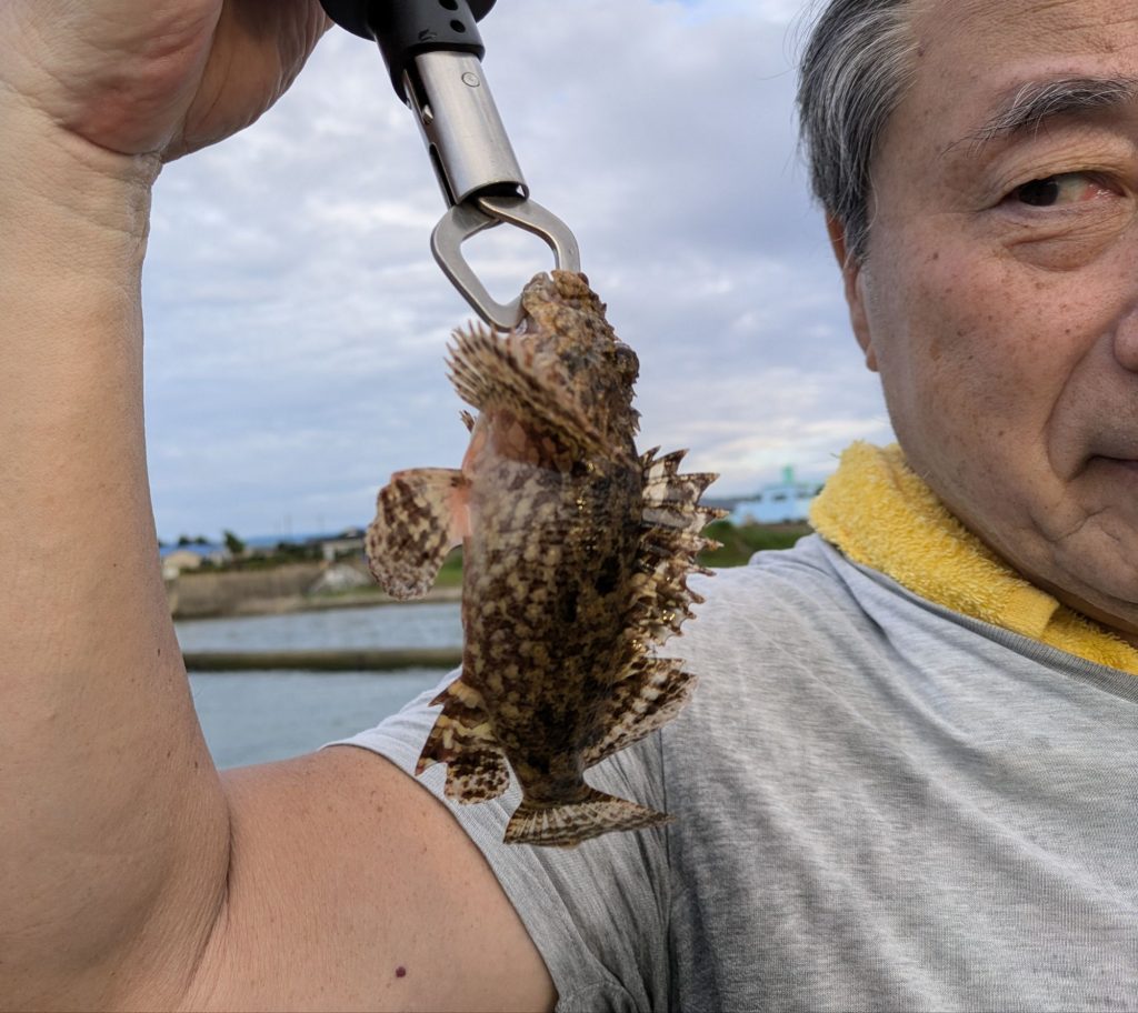 続けてゲットしたウルマカサゴは立派な20cm だがAK柴の顔がデカイので… 。