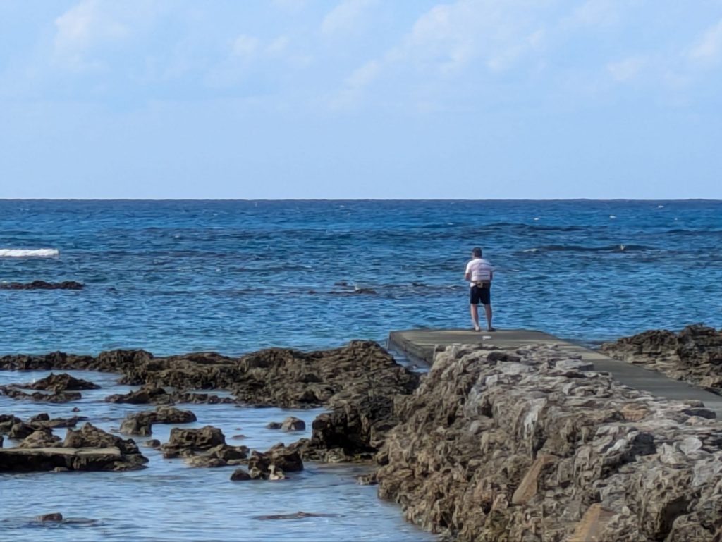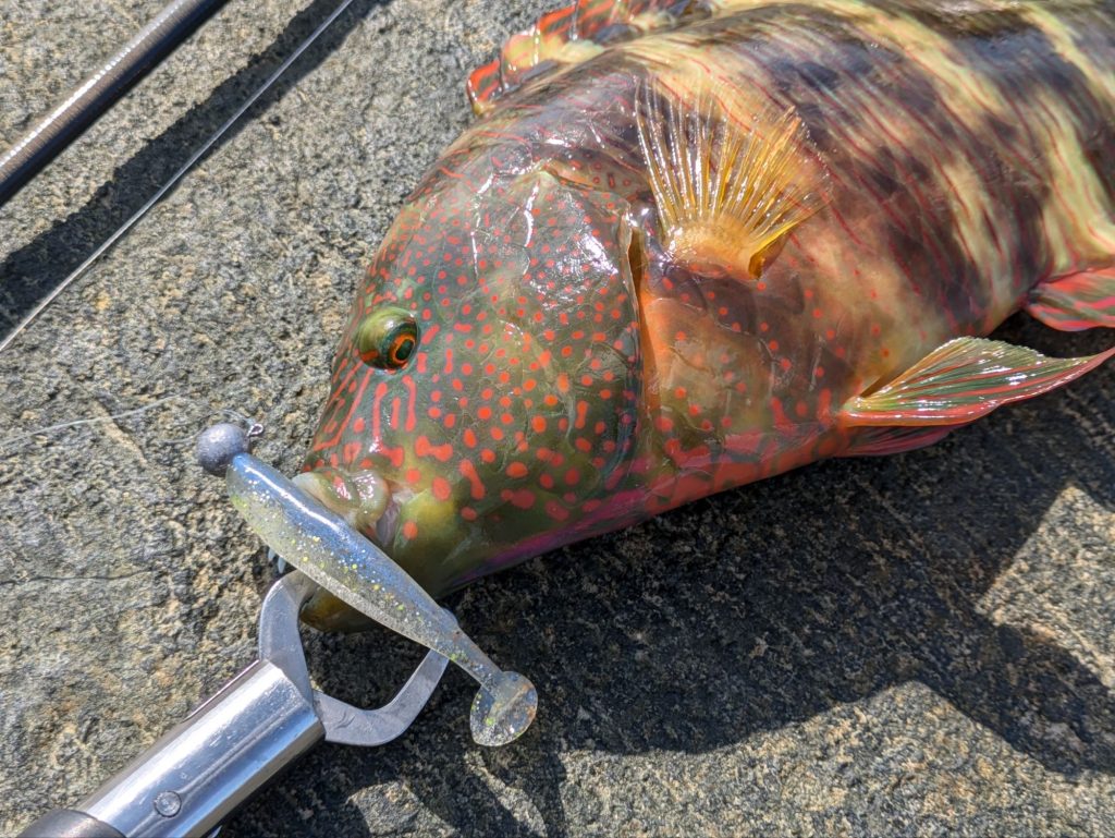 与名間ビーチのリーフがコバルトブルーの外海に繋がる岩場の先端から、気持ち良く南の島の夏の釣りをしていてコイツが来たんで、も〜最高だ!