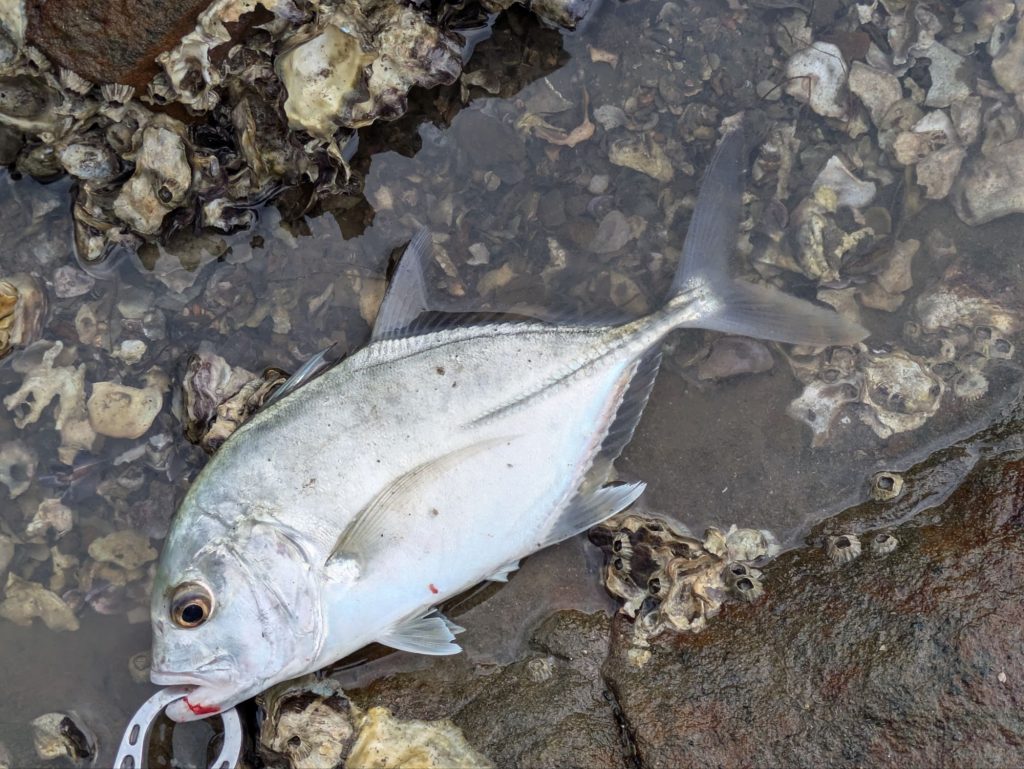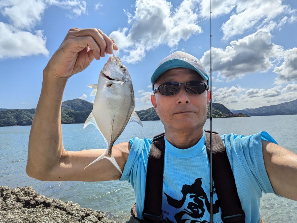 朝とは一変した夏空の下、メッキアジ25cmゲ〜ット!コイツを寄せて来た時、なんとすぐ後ろにクロダイのチェイスが!