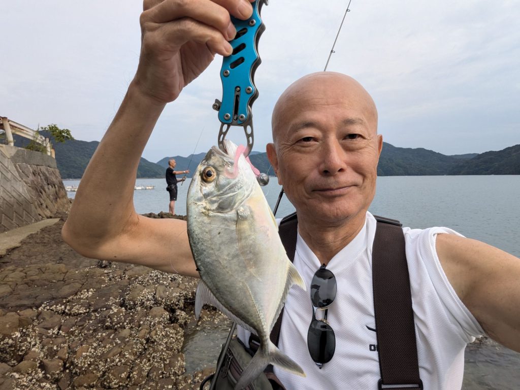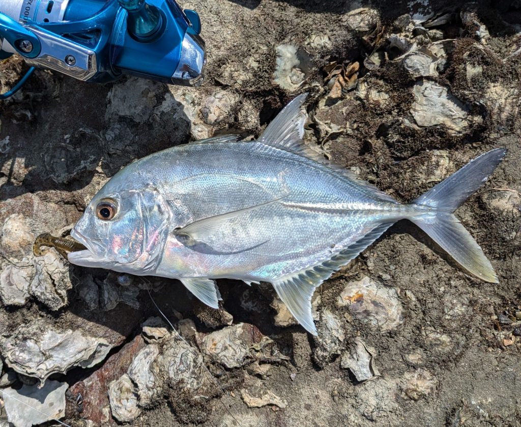 23cmのギンギラに輝くメッキアジ!パワー充分、O田は存分に引きを味わった。