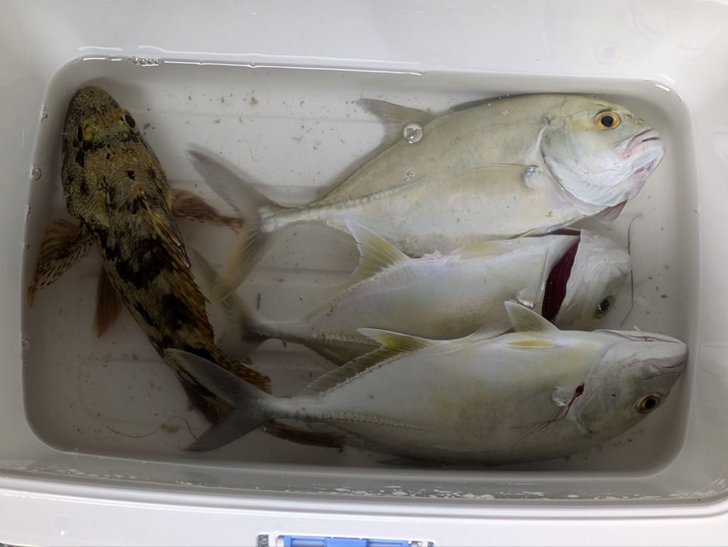 今回の天草水産の漁獲で特筆すべきはメッキアジ(ヒラアジ)が二人で10匹も揚がったことだな。