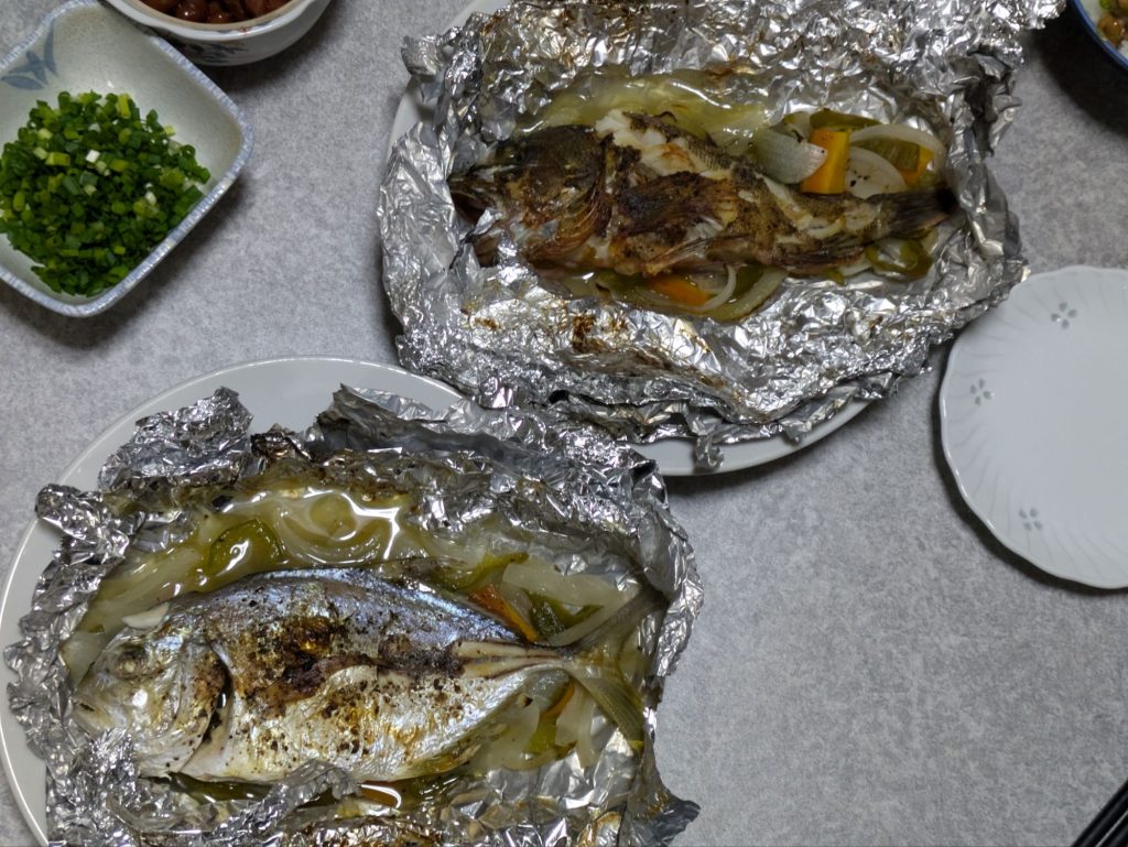 今朝の獲物、ガラカブ23cmとメッキアジ24cmをホイル包み焼き。
