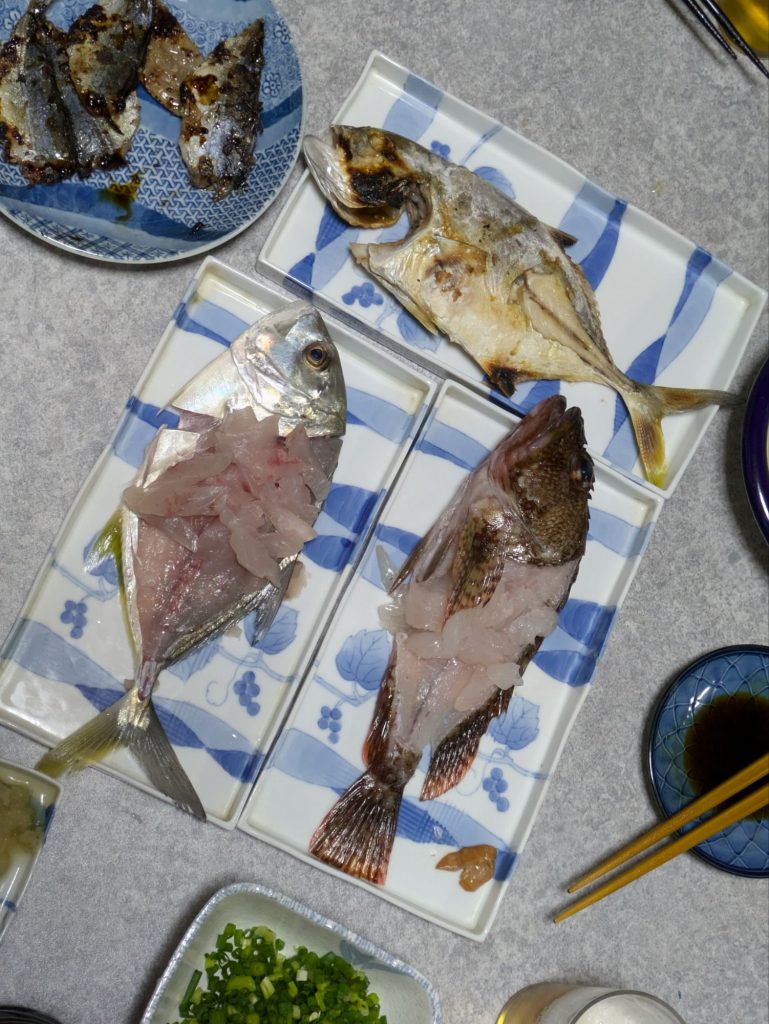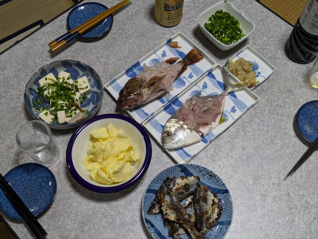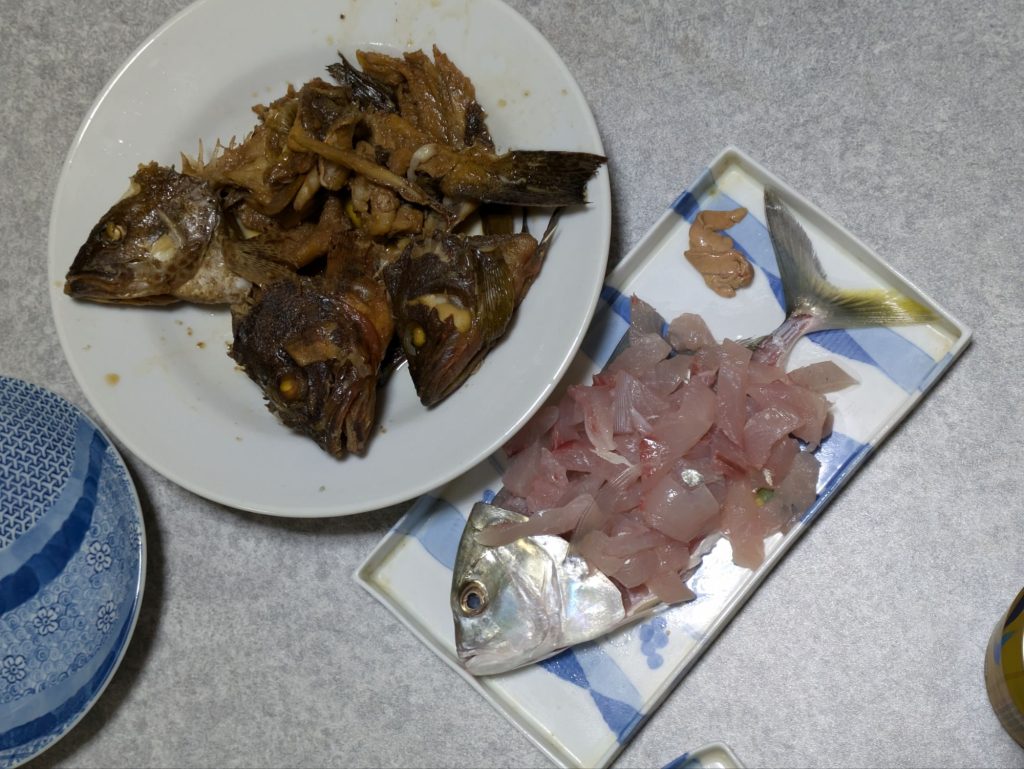 今朝の24cmのガラカブ(カサゴ)と昼の25cmのメッキアジ、冷蔵庫の残り物アジの味醂干し、冷や奴、タクワンかと思ったら辛子蓮根チップス!etc… 。