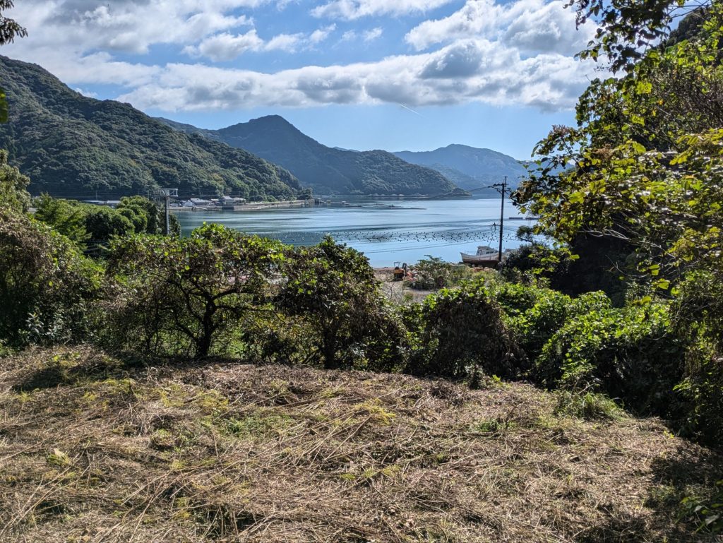 我が家の下の段は草刈りが済んでスッキリ。手前に枝を拡げていた樹は根元からバッサリ、奥の樹は高い枝を払って、我が家の玄関からは羊角湾が一望だ。